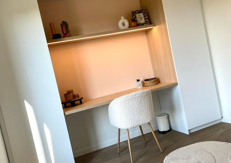 Het bestaande parket werd behouden en vormt een mooie, natuurlijke basis. De maatwerkkasten werden uitgevoerd in een tijdloze offwhite tint, zodat de kamer moeiteloos kan meegroeien met haar bewoonster.